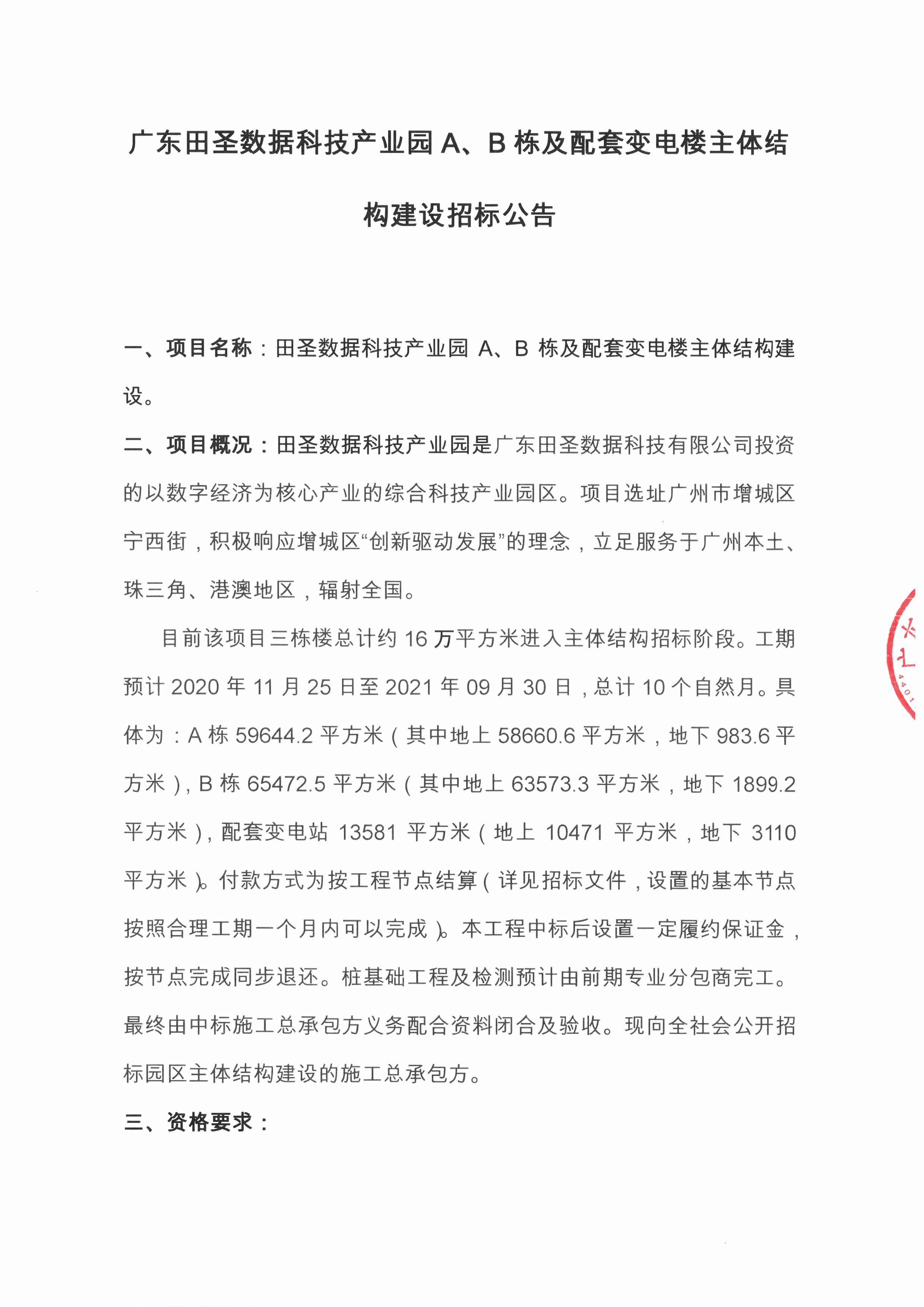 广东田圣数据科技产业园A、B栋及配套变电楼主体结构建设招标公告